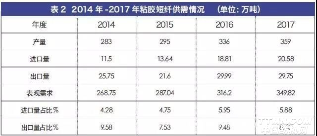 1.3 出口量占产量权重小:我国虽然是粘胶短纤大国,但在世界市场上我国的粘胶短纤占有率并不是太高。从2014年-2017年我国粘胶短纤使用量表观数据看,近几年我国粘胶短纤进口量占表观需求量平均比例在5%附近,出口量占表观需求量平均比例在9%附近。且根据不同的年份,粘胶短纤出口量还有所起伏,如2015年与2017年,出口比例均比2014年与2016年出现了1%~2%的下降。