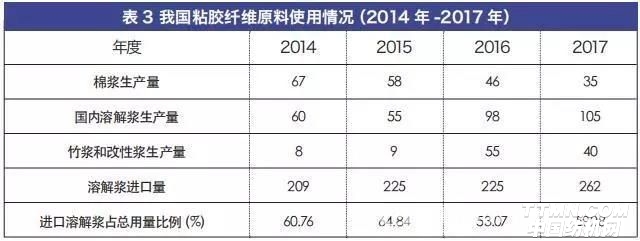 2.1 原材料溶解浆进口量长期维持在60%以上:粘胶纤维生产的主要原料是溶解浆、棉浆以及部分改性浆。目前棉浆以及改性浆以我国自主提供为主。但溶解浆的来源,我国仅仅拥有130万吨/年的产能。2017年我国粘胶纤维的原料供应分别为:棉浆35万吨、改性浆(含竹浆)40万吨、国产溶解浆105万吨、进口溶解浆262万吨,2017年进口量占全年使用量比例为59.28%。