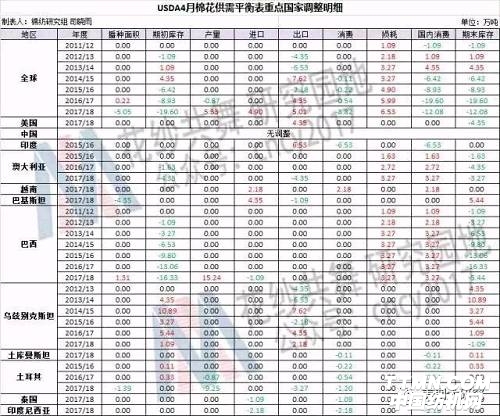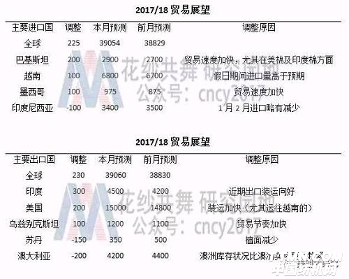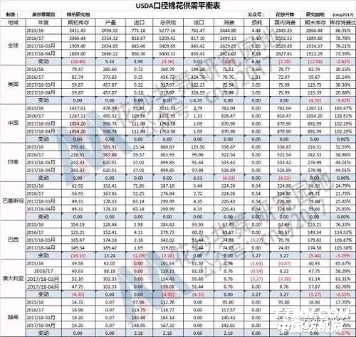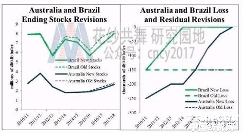 尽管此次期初库存调整相当于17/18年度降低了1.25百万包棉花。但与实际产量上调综合起来看,巴西的17/18年度期末库存仅下调30万包。而澳洲则由于出口预测下调,期末库存下调10万包。