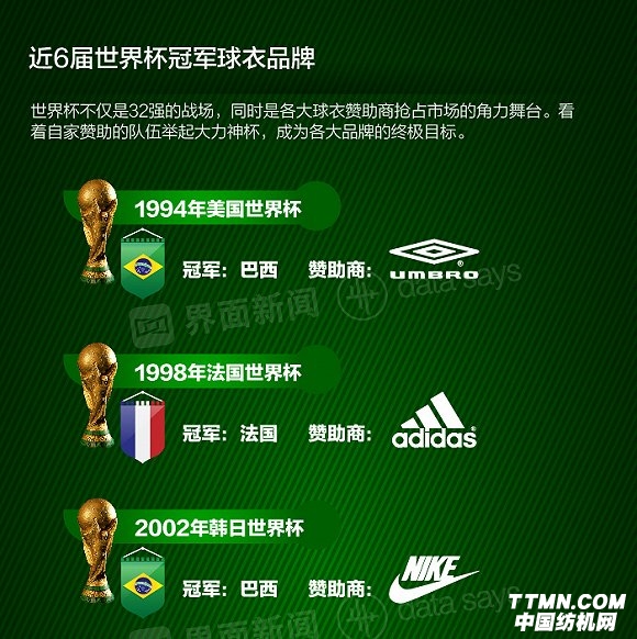 看着自家赞助的队伍举起大力神杯,并以此刺激足球生意,成为各大品牌在世界杯战场的终极目标。过去6届世界杯,阿迪达斯的球队曾3次登顶,依然是主要赢家。耐克、PUMA和Umbro,各自握有一次胜利。