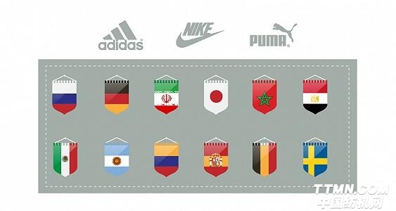 进入决赛圈的32个国家队球衣,总共由9个不同的运动品牌赞助。两大国际品牌阿迪达斯和耐克占据大头,分别拥有12支和10支队伍。作为世界杯传统赞助大牌,PUMA这一次则遭遇滑铁卢,损失了意大利和非洲诸队,手上进入决赛圈的球队仅剩2支。