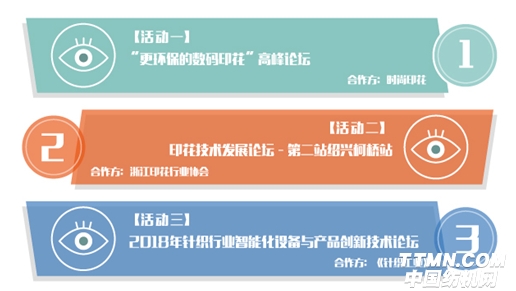 丰富的现场活动也是柯桥纺机及印花工业展较以往做出的突破点和提升。为了给参与展会的每一个人创造更多的收获和价值,主办方通过与国内权威的行业协会及媒体机构合作,精挑细选了推出了三场围绕着印花行业技术、纺织设备智能创新等符合行业热点难点话题的论坛活动。论坛将针对现今行业所需,涵盖政策、市场、技术等不同层面,相信会让每一位现场参与者收获满满。