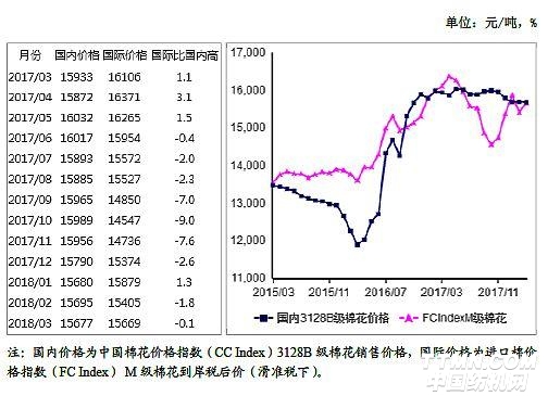 (一)国内棉价持平略跌。3月,纺织企业节后陆续开工,用棉需求有所回升。储备棉稳定投放,企业原料采购选择增多,纺织企业对市场持观望态度,国内棉价持平略跌。3月,国内3128B级棉花月均价每吨15677元,环比跌0.1%,同比跌1.6%。郑棉期货主力合约(CF809)月结算价每吨15290元,环比涨0.6%,同比涨2.8%。