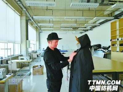 在众创空间二楼的中样板房内,吉文为当地企业设计男士风衣样衣。据了解,中样板房约660平方米,可供设计师进行专业制服、样衣制作、柔性化生产。