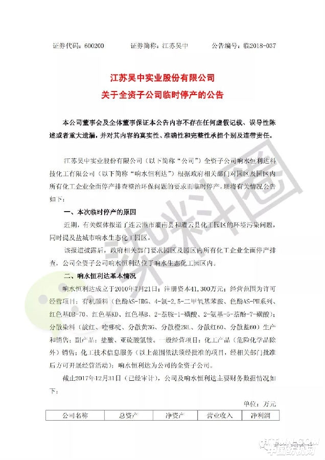 江苏吴中实业股份有限公司(以下简称“公司”)全资子公司响水恒利达科技化工有限公司(以下简称“响水恒利达”)根据政府相关部门对园区及园区内所有化工企业全面停产排查整治环保问题的要求而临时停产。