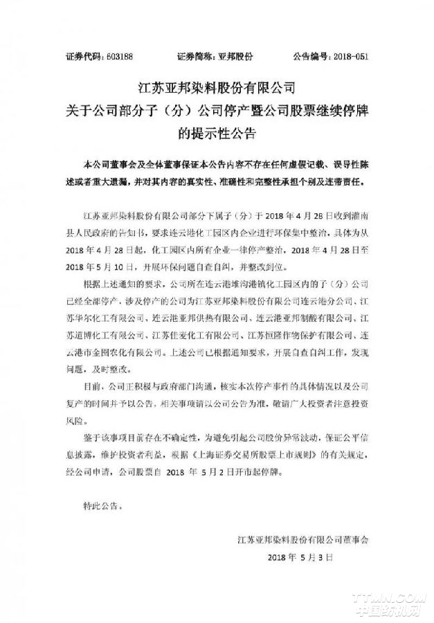 亚邦,闰土,吴中三大染料巨头紧急出公告