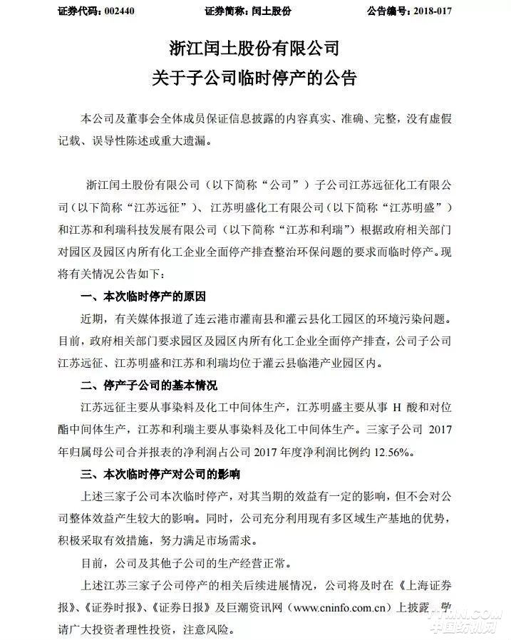 浙江闰土股份有限公司(以下简称“公司”)子公司江苏远征化工有限公司(以下简称“江苏远征”)、江苏明盛化工有限公司(以下简称“江苏明盛”)和江苏和利瑞科技发展有限公司(以下简称“江苏和利瑞”)根据政府相关部门对园区及园区内所有化工企业全面停产排查整治环保问题的要求而临时停产。