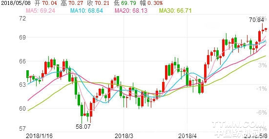 由于市场对美国重新向伊朗发动制裁的担忧不断加剧,从情绪面支撑了国际油价的稳步提升。迪拜国家银行曾在报告中表示,若美国对伊朗实施制裁,全球石油供应量每天可能减少80万桶。在OPEC和其它主要产油国实施减产协议之际,由于担心伊核问题会引起原油供应减少,使全球油价自2014年11月以来,首次上涨至每桶70美元以上。