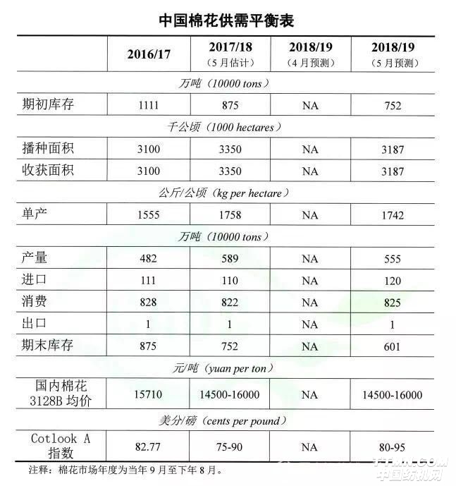 本月预测,2018/19年度,中国棉花播种面积为3187千公顷,较上年度减少4.9%。尽管近三年新疆棉花补贴政策稳定,但受植棉比较收益低和劳动力短缺影响,新疆棉农植棉积极性有所下降;内地棉区受植棉收益较低、劳动力机会成本高以及棉花卖难等因素影响,植棉面积继续萎缩。棉花单产为每公顷1742公斤,较上年度下降0.9%。棉花产量为555万吨,较上年度减少5.8%。棉花进口量为120万吨,较上年度增加10万吨。新年度仍处于棉花去库存阶段,但国内高品质皮棉供给不足,预计棉花进口量增加。棉花消费量为825万吨,与上年度持平略增。新年度国内库存仍然宽裕,预测2018/19年度国内3128B级棉花均价在每吨14500-16000元区间。国际棉花供需格局收紧,预测2018/19年度CotlookA指数均价在每磅80-95美分区间运行。