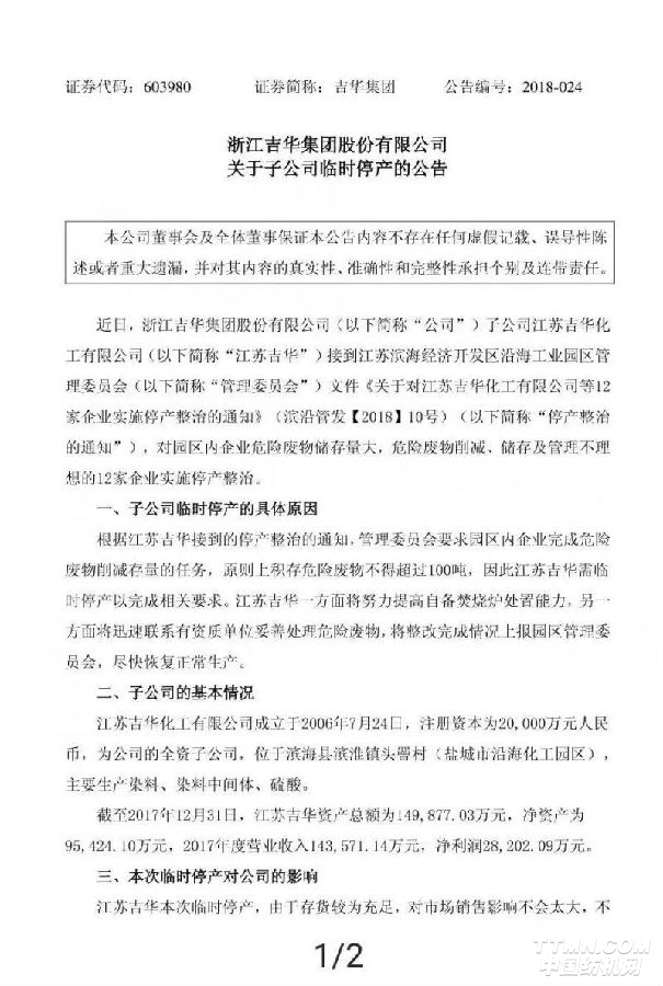 近日,浙江吉华集团股份有限公司(以下简称“公司”)子公司江苏吉华化工有限公司(以下简称“江苏吉华”)接到江苏滨海经济开发区沿海工业园区管理委员会(以下简称“管理委员会”)文件《关于对江苏吉华化工有限公司等12家企业实施停产整治的通知》(滨沿管发【2018】10号)(以下简称“停产整治的通知”),对园区内企业危险废物储存量大,危险废物削减、储存及管理不理想的12家企业实施停产整治。