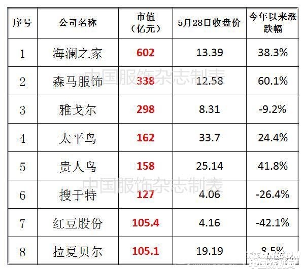 31家公司中,市值过百亿的有8家,较记者5月2日梳理增加1家,同时九牧王以99亿元市值仅差一步之遥。海澜之家以602亿元市值居首,之后依次是森马服饰市值338亿元、雅戈尔市值298亿元、太平鸟市值162亿元、贵人鸟市值158亿元、搜于特市值127亿元、红豆股份市值105.4亿元、拉夏贝尔市值105.1亿元。