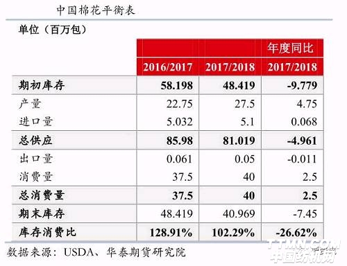 2018年服装消费回暖,拉动棉花需求,而国内棉花种植面积和产量可能同比下降,2018年4月中国棉花协会调查结果预计2018年全国植棉面积为4217.5万亩,同降4.43%。