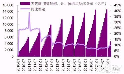 2017年以来国内服装零售持续回暖,2018年1-4月国内服装鞋帽针织品零售额同增9.7%,增速同比提升2.6%,带动上游棉纱等纺织品需求增长。