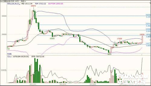自5月初起,郑棉开始尝试突破长期整理形态,新疆天气因素不利棉花种植是主要利多题材。到5月中旬,郑棉加速冲高,连续出现涨停走势,得到美棉上涨的配合令郑棉如虎添翼。虽然期棉大涨过后部分多头离场导致价格回落,此外郑商所也通过调整棉花期货交易手续费的方式发出降温信号,但是郑棉仅休整了五个交易日就再次借助新疆出现大风降温的题材发起冲锋。技术上看,郑棉经过2017年的长期整理之后,目前的突破是延续2016年二、三季度的上涨。从更长的时间跨度看,则是针对2011~2016年初熊市下跌的反弹。今日郑棉主力合约在触及19200元的黄金分割位后有遇阻迹象,但不排除经过整理之后继续挑战22000元或更高阻力位的可能。