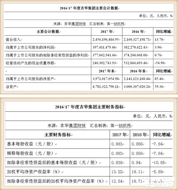 财报显示,吉华集团2017年实现营业总收入24.56亿元,同比增长13.70%,实现归属于母公司股东的净利润3.97亿元,同比增长3.96%。截止报告期末,吉华集团资产总额47.81亿元,比上年末增加59.36%;负债总额6.53亿元,资产负债率为13.66%,比上年末减少了10.19个百分点;归属于上市公司股东的股东权益总额为39.71亿元,比上年末增加85.46%。
