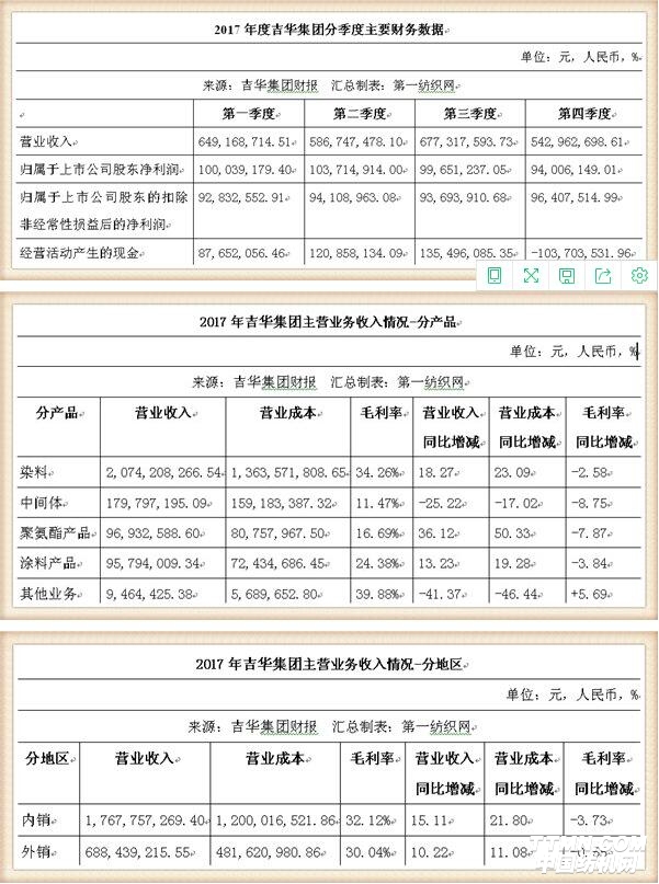吉华集团表示,2018年力争实现营业总收入29亿元,比上年增长18.08%,利润总额6.5亿元,比上年增长29.09%。未来几年,吉华集团将持续关注染料化工行业,将在现有业务的基础上,调整产品结构、发挥比较优势、加强研发投入,重点以科技创新为先导,提高染料整体装备水平和自动化控制水平,强化清洁生产工艺和资源综合循环利用,继续加大环保投入培育和提升核心竞争力,实施产量规模化、产品系列化、市场高端化、品牌国际化的差异化竞争策略,将吉华集团建设成为国际一流的现代化染料研发与制造企业。