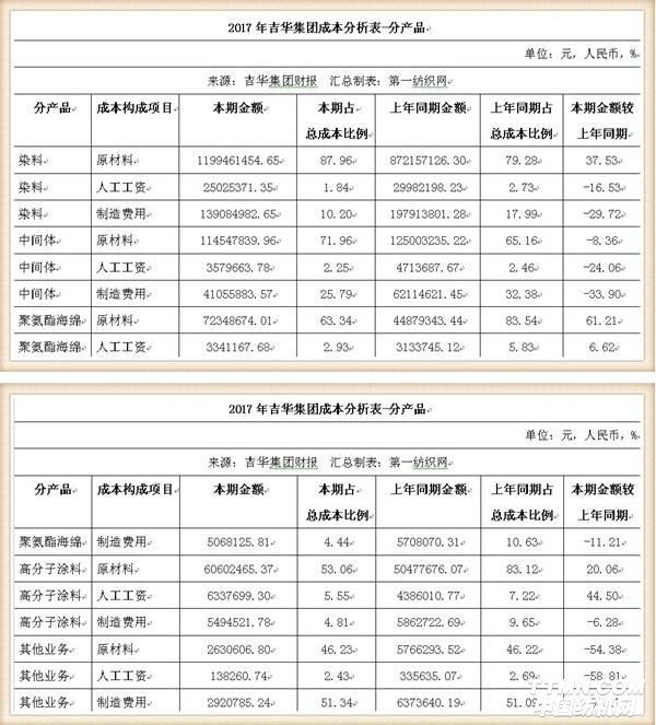 吉华集团具有从基础原料、能源到配套中间体直至“三废”处理较为完整的产业链。公司分散染料、活性染料等主要产品的原材料如2,4-二硝基苯胺、中间体H酸等,公司均可自行生产,以满足主要产品的生产需要。公司在生产连续性、成本可控性、质量稳定性等方面具有较明显的优势。