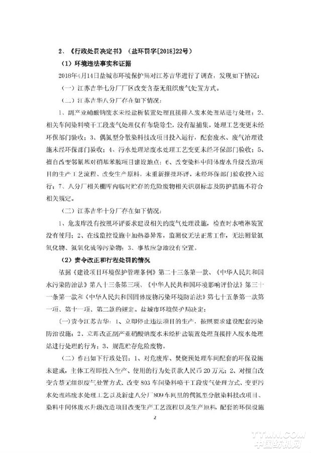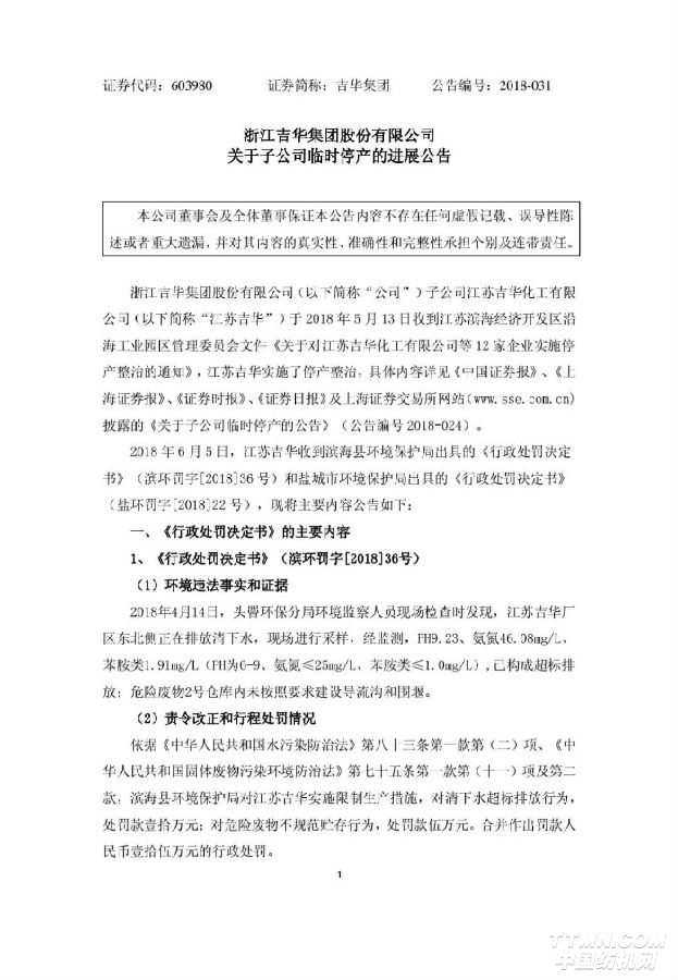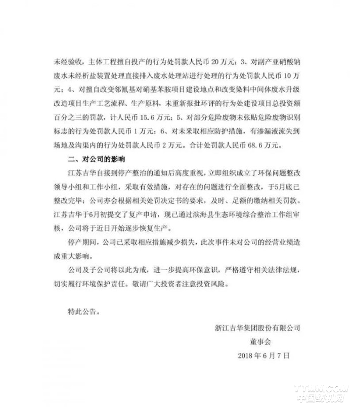 6月7日,吉华集团发布公告,其子公司江苏吉华6月5日收到环保局的处罚决定书,共被罚款83.6万元;并于6月初提交了复产申请,已通过滨海环保综合整治工作组审核,将于近日逐步恢复生产。