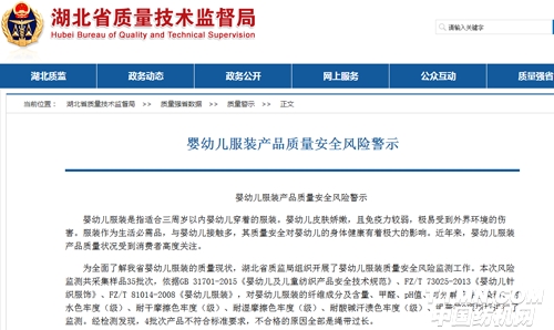 6月11日,湖北省质监局官网发布婴幼儿服装产品质量安全风险警示(以下简称风险警示)。