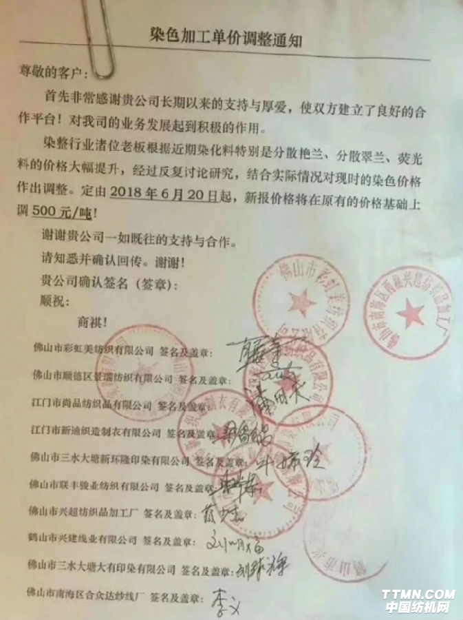 继6月2日江苏南通7家印染厂、6月12日8家印染企业齐发涨价通知后,广东佛山、江门10家印染厂再次齐发涨价通知:6月20日起,新报价格将在原有的价格基础上调500元/吨。