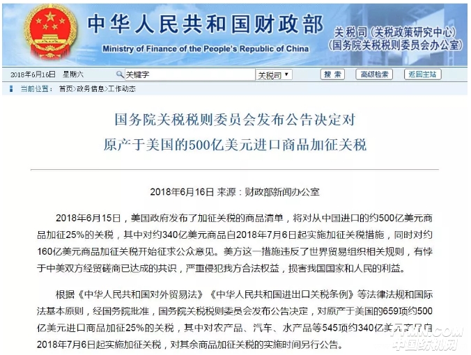 对此,财政部16日凌晨发布公告:国务院关税税则委员会决定对原产于美国的659项约500亿美元进口商品加征25%的关税,同时公布了加征关税的商品清单。