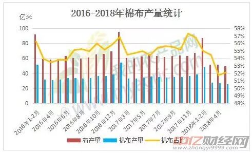 如图,棉布产量与布产量成正相关趋势,棉布占比持续下滑。今年我国布产量相比之前同期而言下降明显,且呈弱势走低趋势。