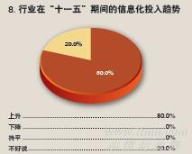 行业由众多的单个企业组成,当这些单个企业在未来3年的信息投资将“稳步增加”时,行业整体的投资趋势自然是上升的。调查表明,有80%的企业在回答这一问题时选择了“上升”,20%的企业不太明确,选择了“不好说”,选择“下降”和“持平”的企业均为零。这说明,未来行业信息化的整体投入将呈上升趋势。