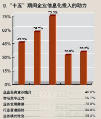企业进行信息化投资的动力,不同的企业可能各不相同,但也存在一些共性的因素。调查显示,无论是“十五”还是“十一五”,“业务发展需要”是企业进行信息化建设的最大动力,选择率达73.3%,因“市场竞争压力”产生的约占56.7%,此外,“企业自身意识提升”、“行业普遍趋势”和“业务模式转变”的选择率分别为43.3%、30%和33.3%。