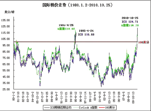 综观近30年来的国际棉价可以看出,截止到2010年10月26日,国际棉价再现历史新高,在过去的30年中,棉花最高价出现在1995年,但仍低于此次棉价大幅上涨的峰值。