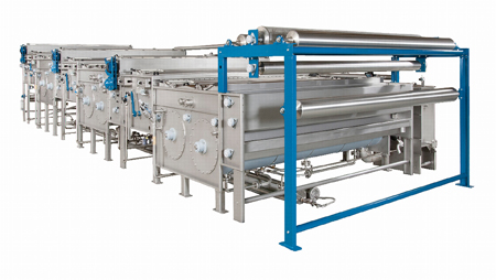 高樂 - SINTENSA PLUS針織物連續濕處理水洗箱(4號館,展台C121) 新突破:SINTENSA PLUS針織物連續濕處理水洗箱 高樂水洗箱以低張力,織物無褶皺及連續穩定性為亮點,現成功地向市場推出具有創新設計的SINTENSA PLUS(圖4)水洗箱。新SINTENSA PLUS水洗箱比過往的更省水,省助劑及節能。 SINTENSA PLUS的關鍵組成部件為液下多孔轉鼓。在轉鼓內裝有一個轉子,其表面經過特別設計,可使液體多次穿透織物。通過轉子和轉鼓的相互作用,可產生震盪湍流的水洗效果,而織物的水洗效果不受其運行速度和結構所影響。 另外,水洗箱配備了一套特殊可調節的噴淋系統,可使洗液均勻且連續不斷地噴淋在整個門幅織物上,以獲得最大的水洗效果。 為了精確控制織物的張力,包括帶轉子的多孔輥筒在內的所有織物導輥,均由獨立的變頻馬達驅動。 為了有效地防止卷邊,所有轉鼓和導輥之間的間距最小化,確保最短的無接觸織物路線。 通過對箱體液體容量和水洗處理技術進行最大限度的優化,SINTENSA PLUS水洗箱不但使不同纖維的針織面料獲得高品質的水洗效果,而且也可幫助印染企業節約大量寶貴的水資源及電能。