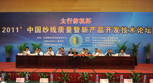 本站讯(通讯员 张 林/摄影 侯绍亮)由全国棉纺织科技信息中心、《棉纺织技术》期刊社、中国纺织科技信息网主办,河北太行机械工业有限公司冠名,石家庄市常山恒新纺织有限公司等多家单位协办的“太行纺机杯”2011中国纱线质量暨新产品开发技术论坛于5月18-20日在石家庄市亚太大酒店隆重举行。中国工程院院士、西安工程大学名誉校长、教授、博士生导师姚穆,中国纺织工业协会秘书长杨纪朝,河北省工信厅副厅长徐振川,石家庄市纺织工程学会会长王绍元,全国棉纺织科技信息中心主任傅恩福,常山集团董事长汤彰明,纺机公司经理徐小敏等纱线行业专家人士出席了论坛开幕式。公司董事长、党委书记李军出席开幕式并讲话,总经理郑英军在“太行之夜”晚宴上致辞。