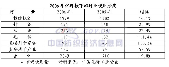 2006年化纤用于家纺93万吨,增幅116%,用于产业152万吨,增幅53.5%,均高于棉纺、针织、丝织、毛纺的增幅,这种情况自2001年起,已持续5年。