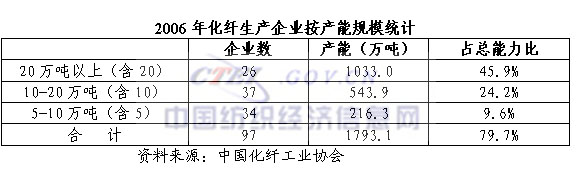 产能向大企业集中:2006年,年产20万吨以上企业26家,合计产能1033万吨,已接近总产能的50%,平均产能39.7万吨/年;年产10万吨以上企业63家,合计产能1577万吨,占总产能70.1%,平均产能25万吨/年;5万吨以上企业97家,合计产能1793万吨,占总产能比例接近80%,平均产能为18.5万吨/年。这些企业是中国化纤产业参与国内外两个市场竞争的主力。