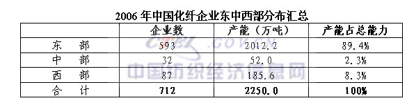 按产能统计,2006年东部为2012万吨,占总产能的89.4%,仅江浙两省产能1488.6万吨,占总产能的65.2%;中部仅为52万吨,只占2.3%;西部为185.6万吨,占8.3%。