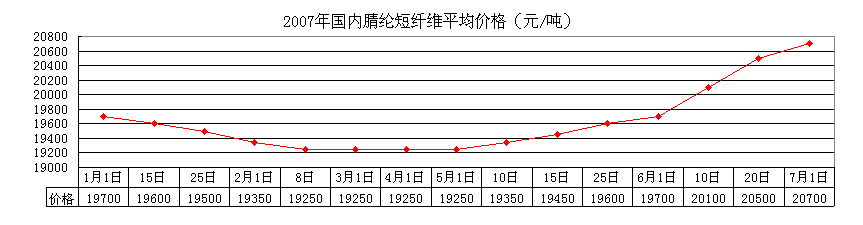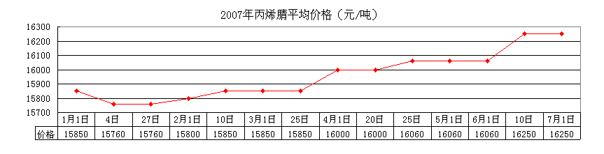 5月上旬由于国内工厂集中检修,丙烯腈出厂价格暂时没有作出调整,保持相对稳定。国内中心交易价格稳定在16060元/吨左右。外盘CFR远东及东南亚在1685-1695美元/吨之间,比节前上涨5美元/吨左右。美国市场上涨幅度较大,FOB美国海湾报价在1650-1660美元/吨,比前一阶段上涨30美元/吨左右。由于现货供应紧张以及下游需求强劲等因素的推动,欧洲市场价格也持续走高。地中海报价在1730-1740美元/吨左右。进入中旬,国内市场依然保持稳定。中心交易价格仍保持前一阶段水平,在16060元/吨左右。外盘亚洲方面保持相对稳定状态,在需求旺盛和供应紧张的背景下,亚洲市场稳定在历史性高位1690美元/吨附近。CFR远东及东南亚约在1685-1695美元/吨左右。美国地区再创历史高位,达到1740-1750美元/吨。欧洲市场价格持续上行,部分交易价格已达1800美元/吨以上。造成中上旬国内市场稳中略升的原因主要在于,第一、外盘价格保持稳步上行,对内盘价格的稳定起到积极支撑作用。第二、丙烯腈整体供应紧张,贸易商销售心态平稳。第三、吉林设备因电力原因停车,抚顺设备在检修中,导致供货紧张。第四、预计后市对丙烯腈供应紧张情况会进一步加剧,导致贸易商产生惜售心理,部分贸易商已经封盘。下旬,国内市场仍然保持稳定,交易价格没有发生大幅度波动,稳定在16060元/吨左右。外盘亚洲方面受供应紧张、需求旺盛、国内设备集中检修或以外故障、以及中国大陆腈纶市场的启动等因素的影响,价格持续上行。CFR远东约在1700-1705美元/吨,比前一阶段上涨12.5美元/吨左右。CFR东南亚约在1690-1695美元/吨,比前一阶段上涨2.5美元/吨左右。欧洲和美国市场在月底阶段保持相对稳定,价格维持在前期水平(如图2.1.1)。 (二)腈纶