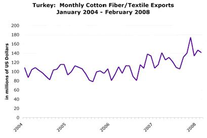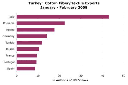 土耳其棉纺织品出口量在2008年第一季度出现飚升。一月份出口量同比增加了36.4%,达14670万美元,紧接着二月份出口量同比增长了29.4%至14120万美元,累计2008年1-2月,总出口量同比上升了29.4%,至28790万美元。