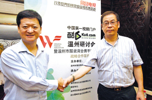 26日下午,温州服装商会会长郑晨爱(右)携手酷6董事长共签战略合作仪式。