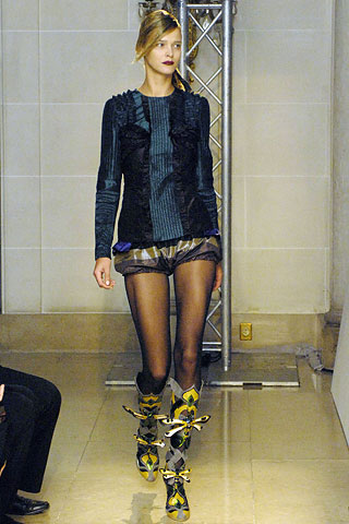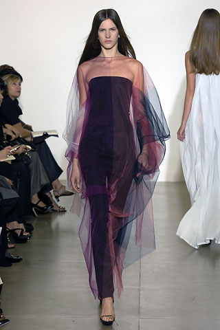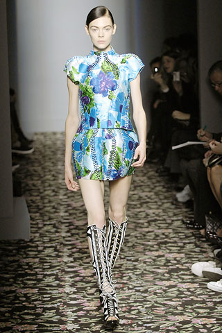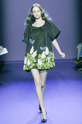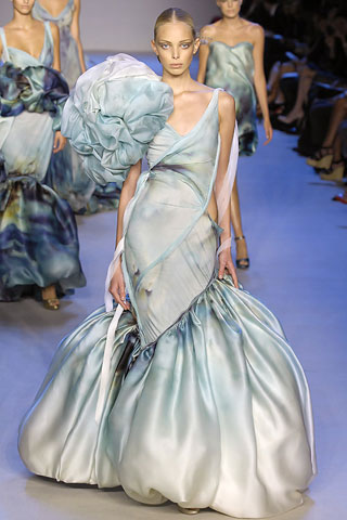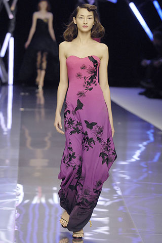 Alexander McQueen 幽美梦幻的色调由粉红渐变至粉紫再至紫黑,黑色的蝴蝶和树叶剪影图案烘托出夜幕降临的氛围。从色彩到图案都取材自日本和服,虽是低胸的西洋礼服形式,感觉依然是东方的含蓄柔和。