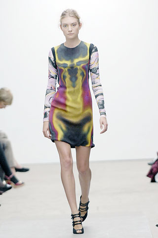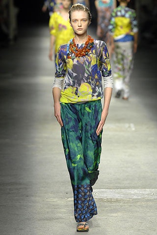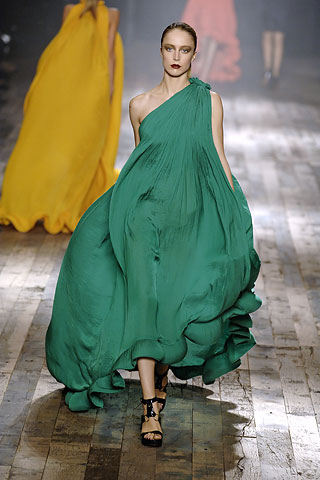 Lanvin 微风吹来,碧绿的湖水波浪涟涟。Lanvin的绿色纯粹得没有一丝杂质,浓郁得就要流淌。丝绸面料轻柔发亮,在一肩聚集,从胸下全部散开,自由地倾泻下来,垂褶如水流般舒畅,在行走间隐隐勾勒出身体的曲线。下摆的荷叶边如同翻动的波浪,把倾泻而下的绿色收拢在一起。用最柔软的面料塑造出最立体生动的外形,这就是老牌时装屋的功力所在。