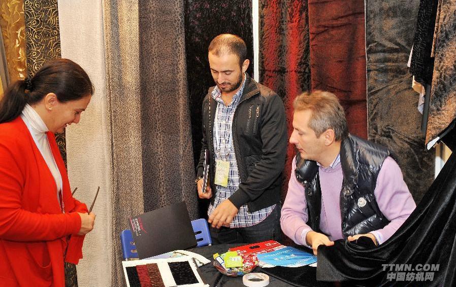 10月25日,客商在柯桥国际纺织品博览会展位上选样洽谈
