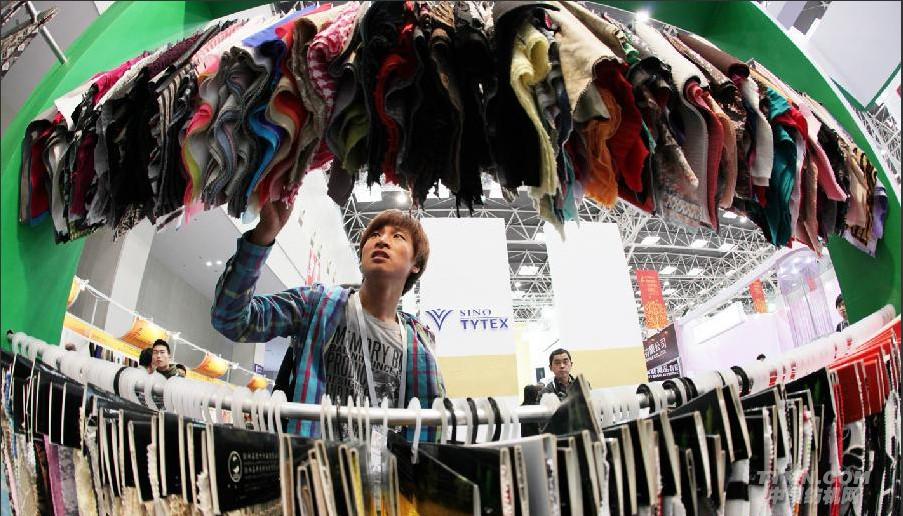 10月25日,客商在柯桥国际纺织品博览会展厅挑选面料