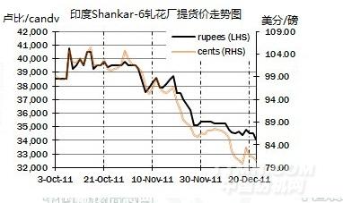 受籽棉收购量增加影响,昨日印度国内棉价继续走低。 Shankar-6轧花厂提货价约34000-34100卢比/candy,折80.50美分/磅,较前一日跌0.75美分;旁遮普J-34新花价格3390卢比/maund,折76.50美分/磅。