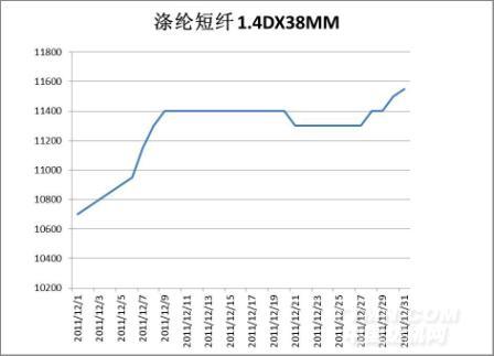 从图中看出,本月(12.01-12.31) 国内涤纶短纤市场走势为盘整向上的趋势。截止月末(浙江涤短市场)1.4D直纺报价在11500元/吨左右与月初初10700元/吨跌幅在7.47%,同比增长-8%。