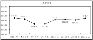 如图1所示,2011年12月份总景气指数收于1343.96点,较11月份上调2.94%,比年初下跌3.17%,同比2010年下跌5.28%。