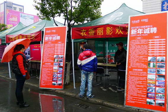 1月28日,春节假期还未结束,务工的外来人潮尚未进城,而在杭州石桥路服装企业密集的天堂经济开发区门口,招工广告已铺天盖地地贴满了整条大街乃至整幢厂房,招工摊位也沿街一溜摆开,各家企业纷纷亮出了看涨的岗位工资、诱人的福利待遇、温馨的企业文化甚至老员工推荐新人的“伯乐奖”,以期尽早招到足够的熟练工人,能够在新的一年里顺利开工。