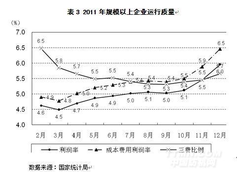 国家统计局统计的1548家规模以上企业全年效益稳步提高。2011年规模以上企业利润率和成本费用利润率比上年增长11.51%和12.80%,三费比例下降3.24%,劳动生产率提高15.10%。在1548家规模以上企业中,有624家企业的利润率大于5.14%(联合会3月份的基准线),占企业总数的40.31%,利润额占比为84.50%,较上年提高了7.32个百分点;其中又有216家企业的利润率大于10%,占企业总数的13.95%,利润额占比为43%,较上年提高了6.04个百分点。
