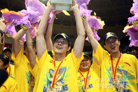 夺冠后,广东队的队员们穿上了CBA最大赞助商——安踏精心设计的总冠军T恤