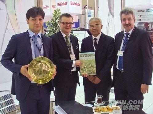 来自乌兹别克斯坦Guliston Tekstil Fayz Baraka有限公司的Gayrat A. Kurbanov将采用立达机器对其工厂进行现代化改造。从左至右:Alisher Razakov (Art纺织), Paul Binkert (立达), Gayrat A. Kurbanov (Guliston Tekstil Fayz Baraka有限公司), Jens-Uwe Bockhahn (立达)。