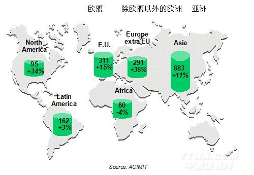 2011年,意大利纺织机械出口划分如下:亚洲49%,欧洲33%,拉美9%,北美5%以及非洲4%。