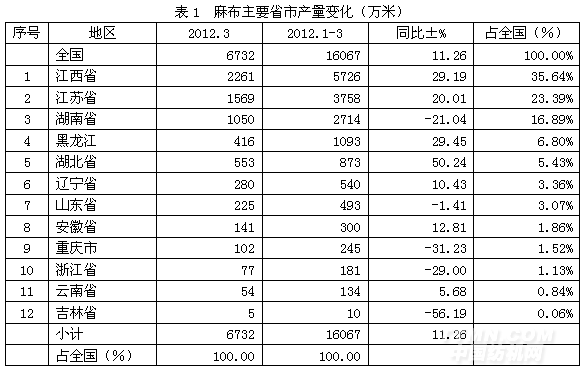 全国麻布2012年1-3月份产量合计为16067万米,比上年同期增加11.26%;其中产量最大的省市是江西省,产量为5726万米,为省市龙头;其次是江苏省,产量3758万米,位居亚军;然后是湖南省,产量2714万米,荣立第三;黑龙江1093万米,为第四;湖北省873万米,占第五;辽宁省540万米,位居第六;接下来是山东省493万米,为第七;安徽省300万米,占第八;重庆市245万米,位居第九;浙江省181万米,为第十名;云南省134万米,居第11名;吉林省10万米,荣立第12名。上述12大省市2012年1-3月份产量合计为16067万米,占全国2012年1-3月份总产量的100.00%。